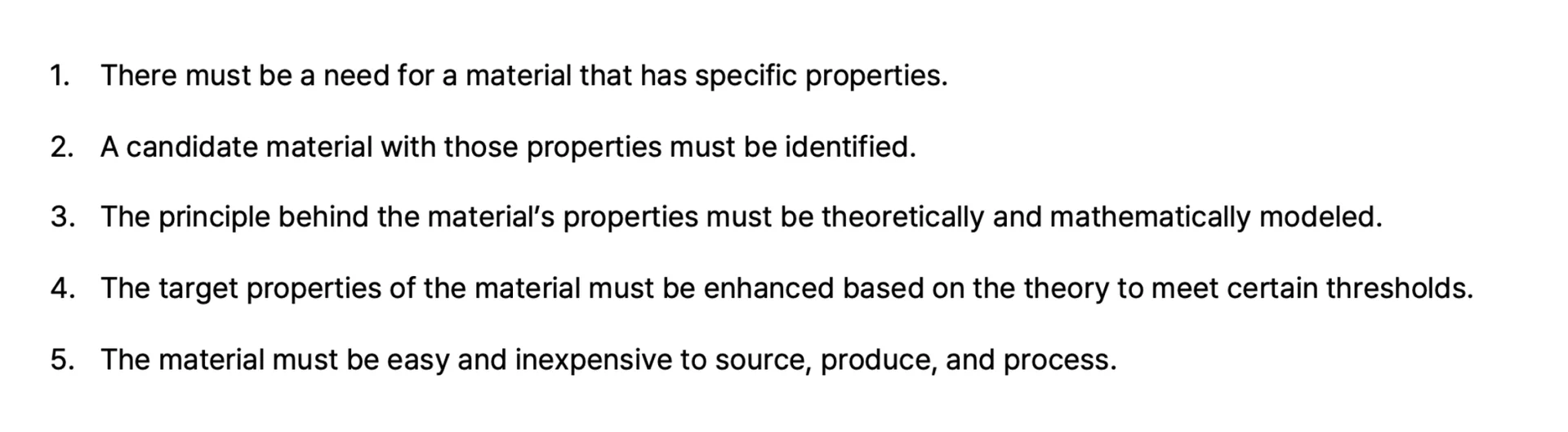 I propose that for any new material to be commercialized, it must meet at least five conditions:
